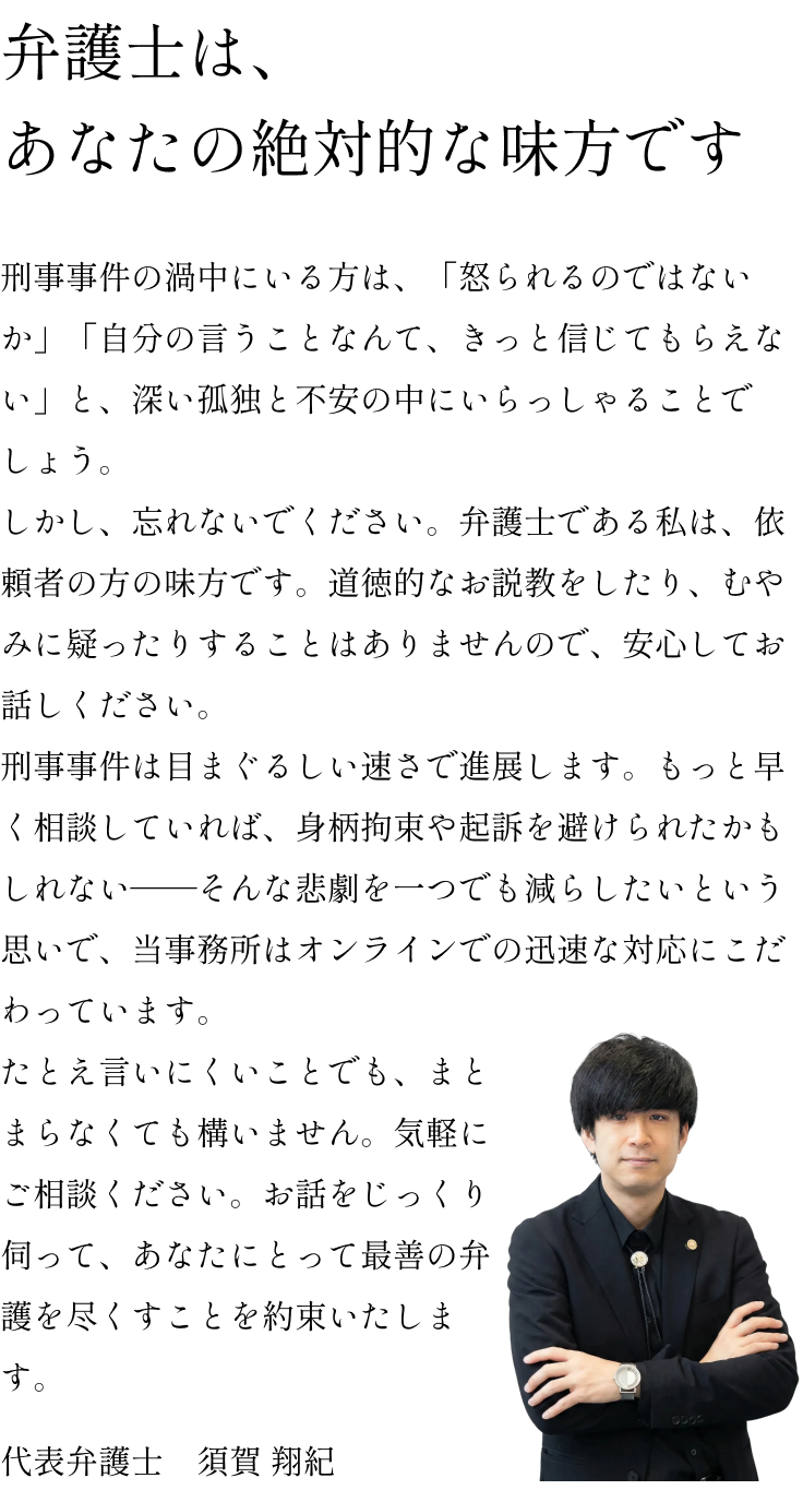 | 代表弁護士 | : | 須賀 翔紀(東京弁護士会 登録番号61954) |
