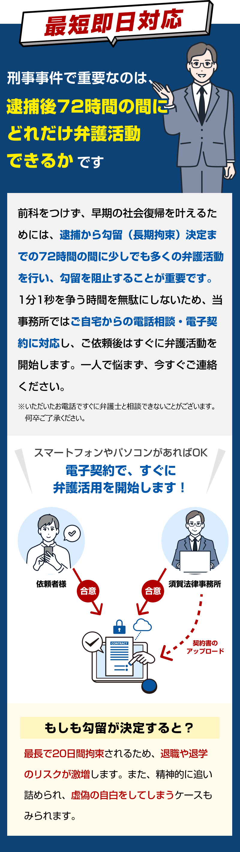 刑事事件で大切なことは、対応のスピード感。当事務所では電話やLINEを使用し、遠隔でもスピーディに対応いたします。電話やオンライン相談、電子契約当の活用により、事務所への来所は一切不要です。全国の皆様からご相談を承っておりますので、遠方の方もご安心ください。
