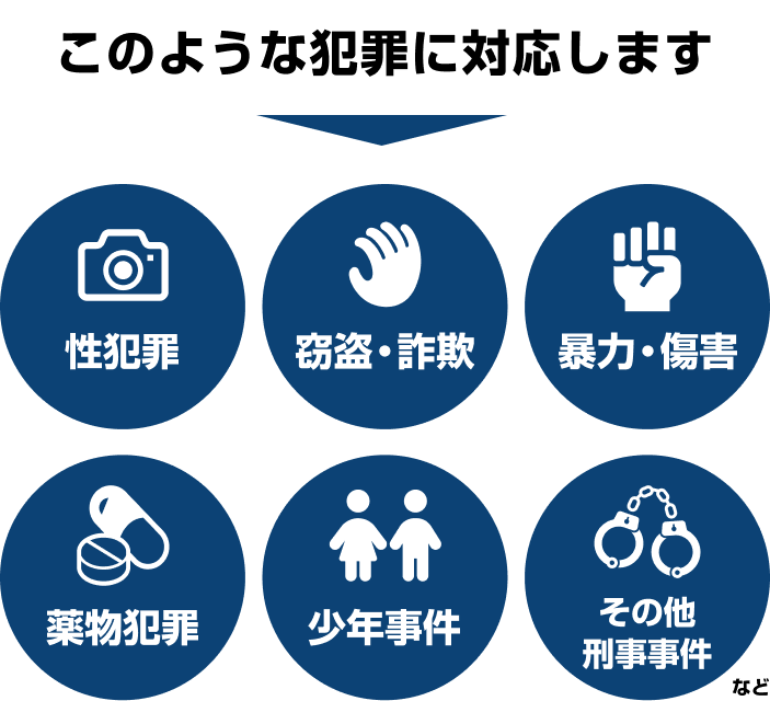 当事務所では、様々な刑事事件の解決実績がございます。とくに、性犯罪(痴漢や強制わいせつ、盗撮など)や窃盗、傷害事件における迅速な示談成立を得意としています。