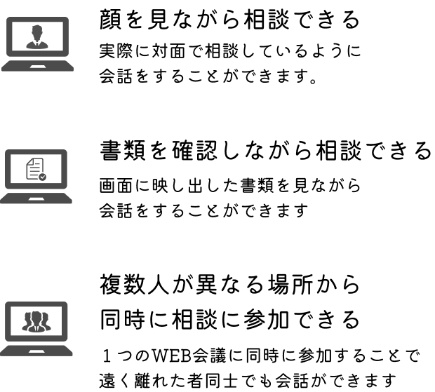 迅速な相談のため、当事務所では電話やオンラインツールにてご相談を承ります。遠方にお住いの方もご安心ください。